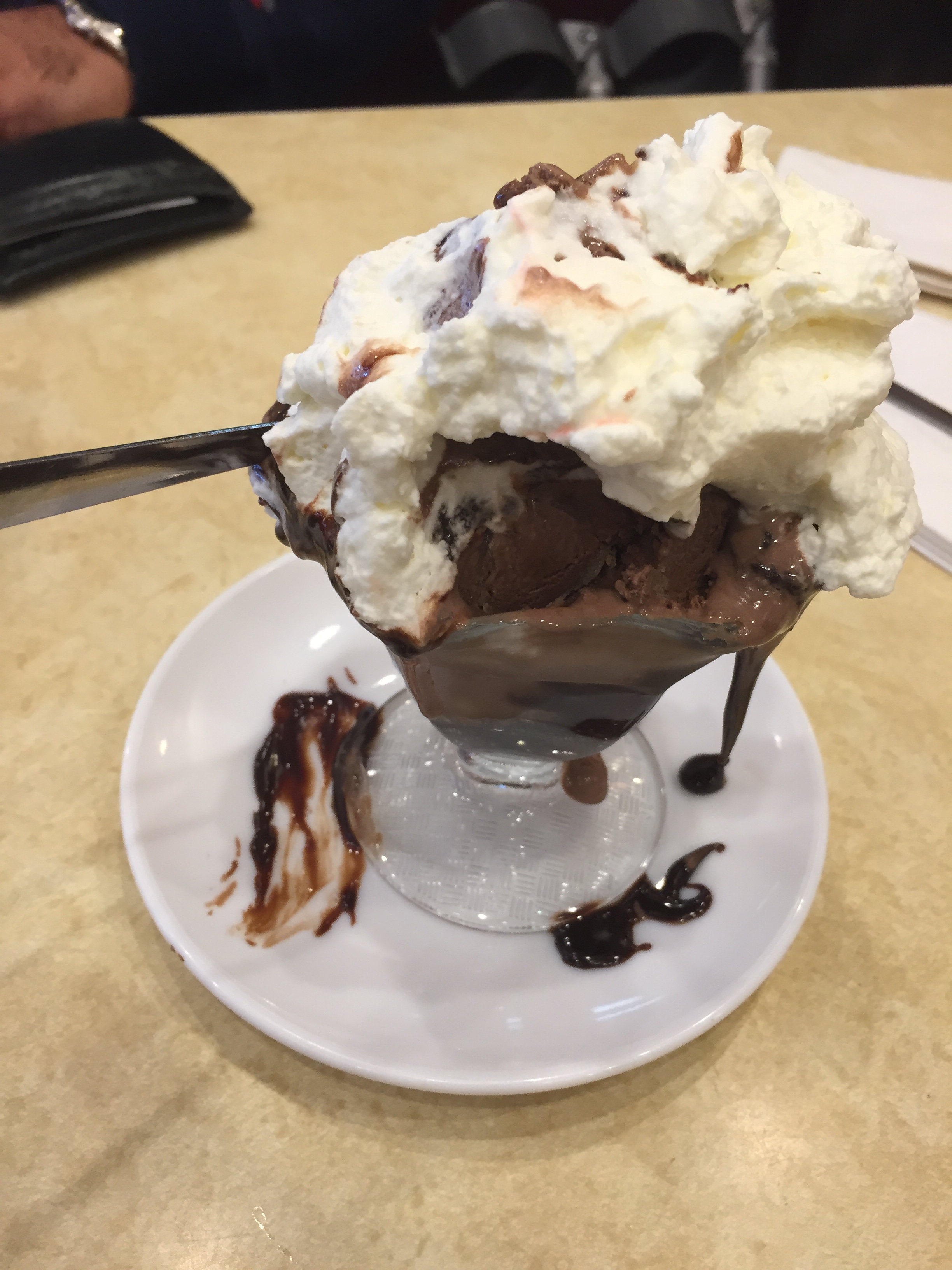Like any responsible adult, I made sure to leave room for ice cream. I ordered the chocolate peanut butter cup ice cream, one scoop instead of my usual two, doused in whipped cream and hot fudge. I don’t usually eat like this anymore, so by the time I was done I was ready to be carted out on a stretcher. It was worth it!